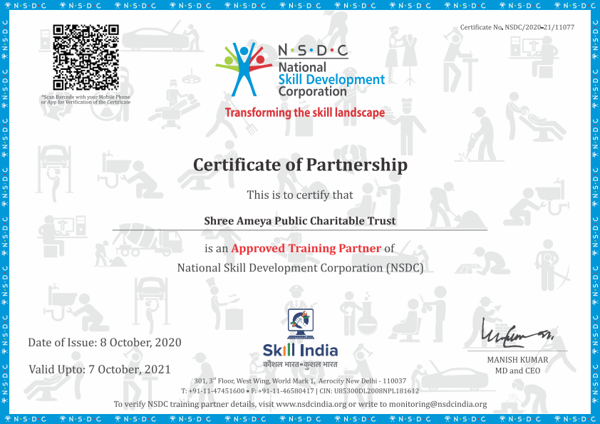 Aditya Centre of Excellence is an NSDC-affiliated training site run by Shree Ameya Public Charitable Trust, which is an NSDC training partner (National Skill Development Corporation). We offer industry-relevant skill training in a variety of fields to help you increase your earning potential. The National Skills Development Council (NSDC) Certification is a nationally recognised credential that enhances employment prospects and facilitates job advancement.